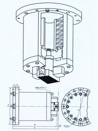 | 型號 | 額定頂力 KN | 油缸工作壓力 MPa | 有效行程 mm | A mm | B mm | C mm | D mm | D1 mm | D2 mm | E mm | 重量 kg |